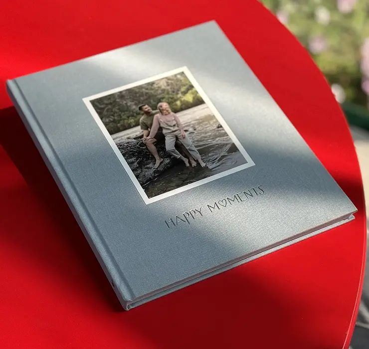 Коллекционная фотокнига Moments and stories в комбинированной обложке серо-голубого цвета
