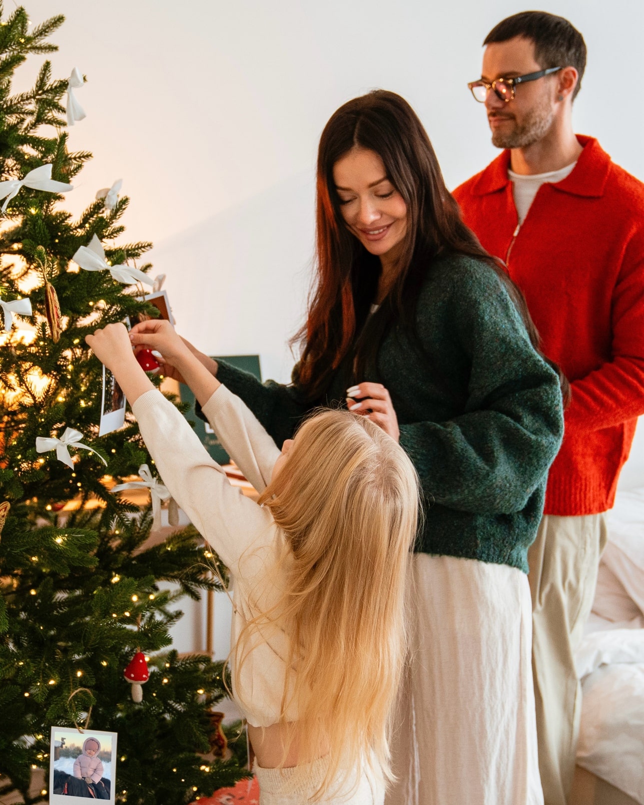 Разместить фото на елке можно с помощью маленьких прищепок или ленточек. В последнем случае выбирайте оттенок материала, подходящий игрушкам, гирляндам и другим нарядным элементам на зеленых ветках.